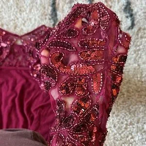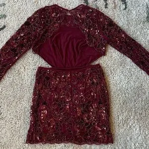 Stunning burgundy mini dress. Features intricate sequin detailing, and open back and long sleeves. Perfect for a night out.
