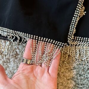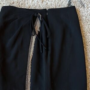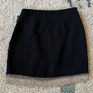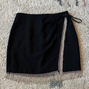 Stylish black mini skirt with dazzling rhinestone trim. Wrap skirt style. Side zipper and lining for secure fit. Perfect for a night out. Brand new with tags!!