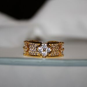 A luxe, sparkly statement ring featuring a crystal-studded floral centerpiece and pavé-crystal detailing along the band. Adjustable, lightweight, and absolutely stunning in person — she catches the light from every angle.