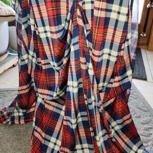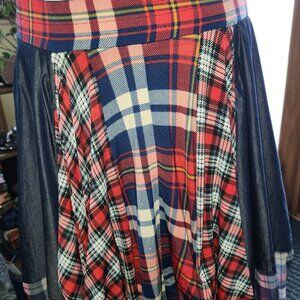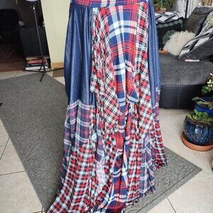 25556. This year's hottest skirt! BOHO Chic, flowy look with Hi-lo hem, Allover mixed tartan print with gathered details and semi bustle back for a unique style! Self fabric elasticized back waist band, two side slash pockets in contrast denim style print. Lots of lightweight fabric, creating a full voluminous skirt with incredibly sexy and feminine appeal. Pull on styling with no buttons or zippers, stretchy back waistband for a great fit. In pristine condition.