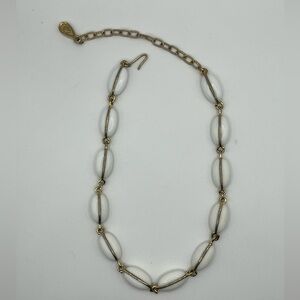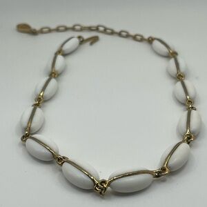 Chic and timeless, this vintage necklace features glossy oval white beads wrapped in elegant gold-tone wire links. The adjustable hook-and-chain closure offers a perfect fit, making it great for layering or wearing solo. A classic statement piece with a retro vibe!