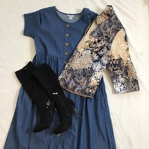 Run errands in this pre-owned Chico's women's blazer, size 3 (equivalent to L), features a vibrant multi-patterned design combining paisley, animal print, and abstract motifs in shades of brown, blue, black, and white. It has a collared neckline and a full-length front zipper closure. The jacket has three-quarter sleeves and appears to be made from a cotton-spandex blend, as indicated by the visible care tag. Measurements show an approximate bust of 22 inches (pit to pit) and a length of 27 inches from the shoulder. The garment shows no significant visible imperfections. Great over a dress, or cute top