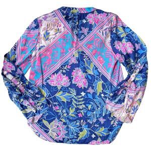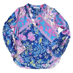 * boho floral blouse, Alice & Trixie silk top, tropical print blouse, resort wear, vacation blouse, preppy bohemian, spring summer top, colorful silk shirt, statement sleeves, relaxed fit blouse, American-made fashion