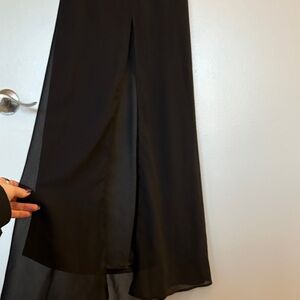 Chic black chiffon maxi dress with lace back detail. Back is also low line. Dress also features a center slit. Perfect for elegant evenings.