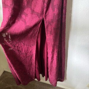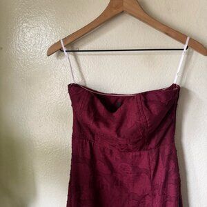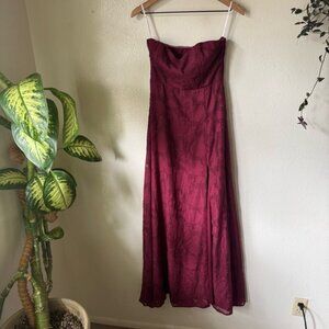 Let your love bloom in the Lulus Garden of Romance Burgundy Floral Burnout Strapless Maxi Dress! Woven jacquard fabric, with a floral burnout design, shapes this dress that has a strapless sweetheart neckline (with no-slip strips) and a princess-seamed bodice with hidden side boning and a small cutout at the back. A high waist tops a luxe maxi skirt with a thigh-high slit at the front. Hidden side zipper/clasp.