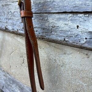 Stylish red leather crossbody/shoulder bag with brown leather accents. Perfect for any occasion. This vintage bag has all weather leather, a flap over front with a leather slip in closure. The exterior back has a large slip pocket and the leather D&B logo. The adjustable strap has a vintage gold toned D&B charm. The interior lining is red suede leather. There is 1 zip pocket and 3 brown leather pouches. Width is 10” height is 7” and depth is 2” This pretty little oldie but goodie was preloved and well cared for. It has a lot of character and charm. However, there is an ink mark on the inside lining and the edges of the straps show some slight wear. Overall this bag is in good vintage condition.