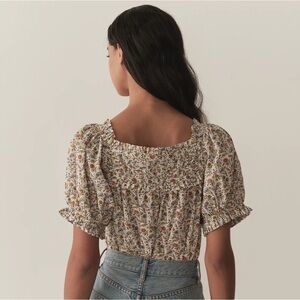 Crafted from a soft, organic cotton lawn adorned with our antique-inspired Jardin du Château print, the Farley Top features a breezy silhouette with a square neckline and short puffed sleeves trimmed with petite ruffles. The square yoke is detailed with alternating panels of pintucks and ruching, while mother-of-pearl buttons extend down the front. Wear it loose, or tuck it into your favorite high-waisted shorts.
