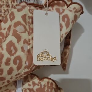 Charming casual set by Agua Bendita. Features a tan leopard print with pink floral accents. Button details and tie straps add a playful touch.