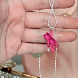 Adorable pink cat pendant with pearl details. Ideal for cat enthusiasts.