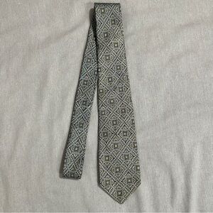 Vintage Brooks Bros. necktie, 100% silk. Neutral taupes/grays, geometric pattern. 3.5" wide at the widest point.