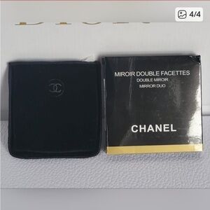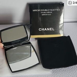 Sophisticated CHANEL compact mirror. Sleek black with gold accents. Perfect for on-the-go touch-ups.