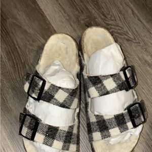 Chic checkered sandals with dual buckle straps. Comfortable and trendy.