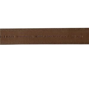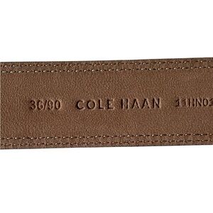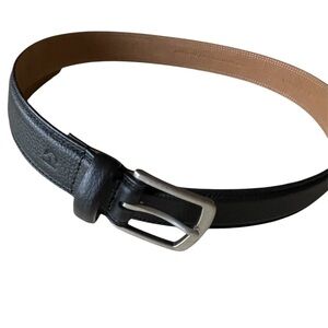 Elegant black leather belt. Features a silver buckle. Perfect for any occasion.