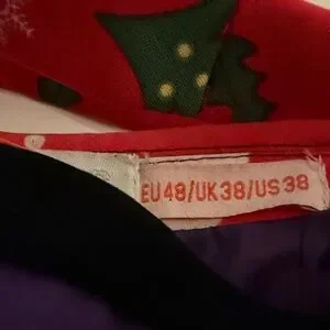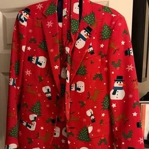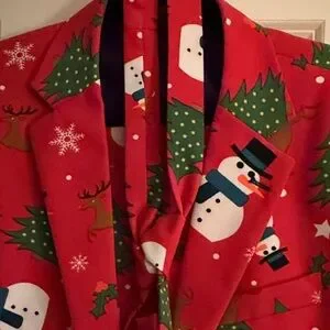 Festive red suit with snowman and tree pattern. Perfect for holiday parties. Stand out with style.