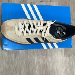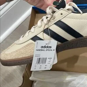 Classic Adidas Spezial sneakers. Cream upper with black stripes. Perfect for casual outings.