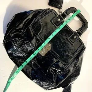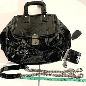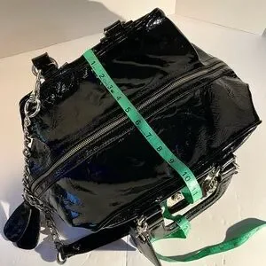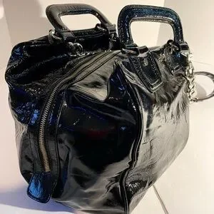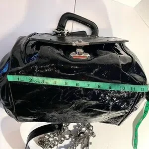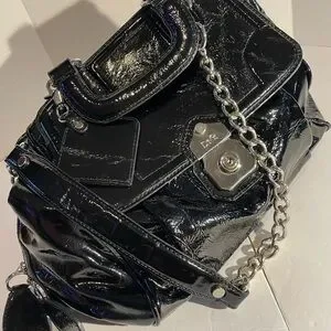 Sleek black shoulder bag with a glossy finish. Features a stylish chain strap and silver accents. Ideal for a sophisticated look.