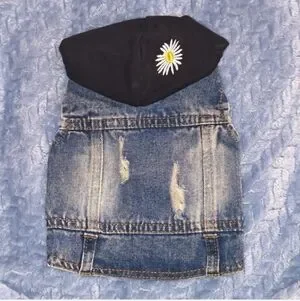 *4 for $28* Size S like new pet jean vest with a black hood. Embroidered daisy on the hood. I put measuring tape in pics so you can make sure you're getting the correct size. This was worn only a couple of times before my baby got too big for it. I think it may be the cutest thing I've ever put her in. It looks great though. No flaws.