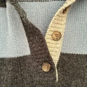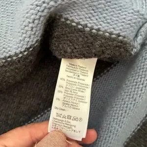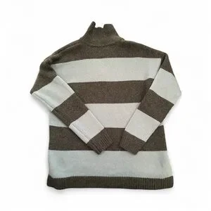 Stylish crew neck sweater. Features bold blue and black stripes. Comfortable and chic design.