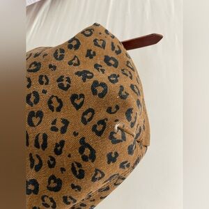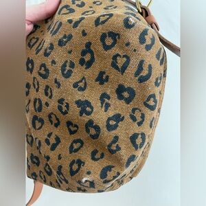 Chic canvas leopard print design. Features a sleek brown strap. Perfect for versatile styling.