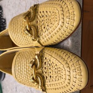 Chic yellow flats with intricate woven design. Features elegant gold chain accent. Ideal for a stylish look.