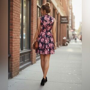 Kate Spade New York Shadow Bud Black and Pink Silk Print Pleated Floral Dress