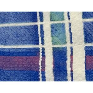 Color/Pattern: Blue and white plaid grid with magenta and green accents
