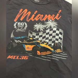 Black t-shirt featuring a vibrant Miami racing graphic with orange and yellow accents.