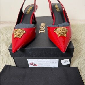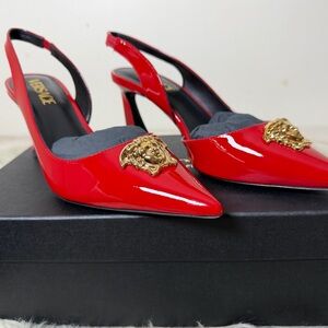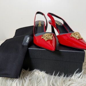 Chic Versace slingback heels in dark red. Stylish and sophisticated.