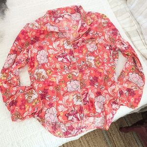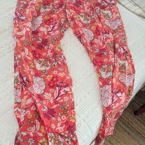 Vibrant floral pajama set by Victoria's Secret. Features a mix of pink, orange, and white colors. Pinstripe detail.