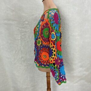 This is a vintage 1990s, Y2K, long sleeve, cropped, , green, sheer orange, yellow, purple & blue crochet, beaded top from MY , M. Y. Juniors. Ramie, cotton. No flaws. For reference the mannequin is a size 6-8 with measurements of: 34 in 26 in 35 in.