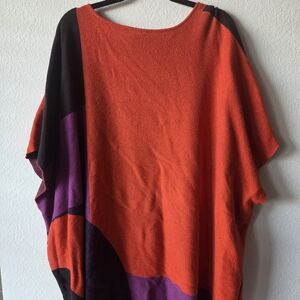 Vibrant women's sweater featuring bold orange and purple hues. Perfect for adding a pop of color to your wardrobe.
