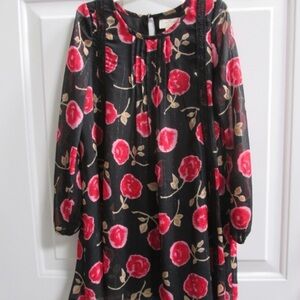 Kate Spade Girls Chiffon Metallic Dress in Hazy Rose. Black with pretty dark pink and red floral rose print. Metallic stripe accents, lace ruffle accents. Back button closure at neck. Long semi-sheer sleeves with elastic cuffs. Lined for comfort. Worn only once, great for parties, gatherings, concerts, Christmas, Valentine’s Day, Dance, holiday, etc.
