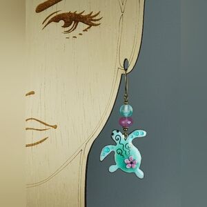 HAND CRAFTED Artisan Enamel Turquoise Aqua Pink Sea Turtle Dangle Earrings