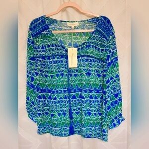 TWO by VINCE CAMUTO Playful Batik Pintuck Peasant Blouse. NWT LARGE