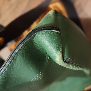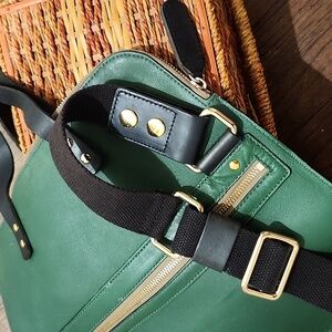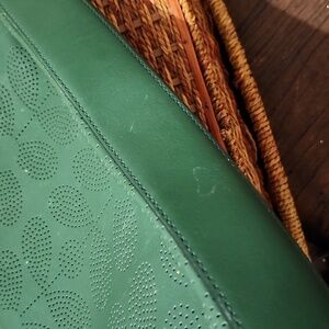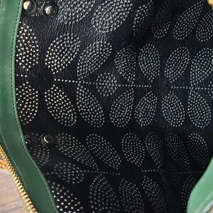 Authentic. Gently used with minimal signs of wear - has some exterior marks and mild corner-wear. Features Orla Kiely's iconic, instantly recognizable Stem pattern, meticulously punched into luxurious, smooth forest-green genuine leather, finished with untarnished shiny gold-tone hardware. Definitely has a playful and uplifting graphic style with a comforting sense of nostalgia. Carry it by the leather handles or wear it comfortably as a crossbody with the durable canvas strap. Slips your things in the back zippered pocket for quick access or stay organized with the two oversized interior pockets (one zip, the other a slip) and elasticated key fob. Leather interior is spacious, clean, and free of ink marks, rips, stains, and odors. A real timeless statement piece!