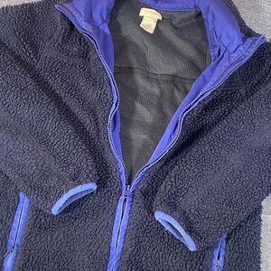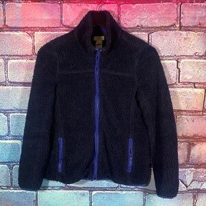 Stay cozy and stylish in this J.Crew faux fur zip-up jacket in a deep navy blue with contrast purple trim. Features zippered front pockets, full front zipper, and a soft textured sherpa feel. Perfect layering piece for cooler weather.