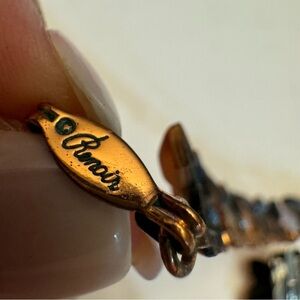 Renoir’s naturalist "Firefly" design was depicted in a vintage issue of Vogue magazine. Back of earring clips are etched "Renoir" preceded by copyright symbol. The necklace have similarly marked "Renoir.”