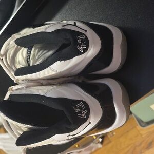 Stylish Jordan athletic shoes. Sleek black and white design. Perfect for sports and casual wear.