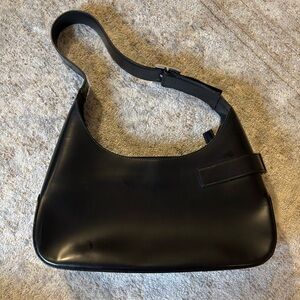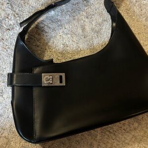 Minimalist Ferragamo shoulder bag in smooth black leather with signature Gancini hardware on the front strap. Sleek and structured silhouette with an adjustable buckle strap for a comfortable shoulder fit. The main compartment opens with a full zipper and features the classic Ferragamo logo lining.
