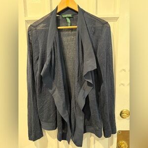 Elegant blue sweater with open front. Lightweight and stylish. Perfect for layering.