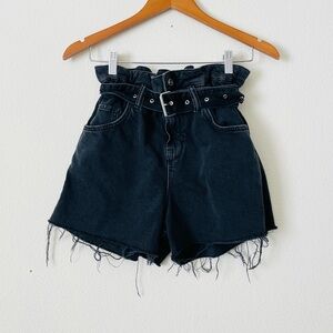 Allsaints Hannah black high rise belted paperbag shorts with frayed hem