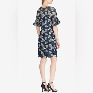 Chic navy dress with white floral lace. Perfect for elegant occasions. Features long sleeves and intricate design.