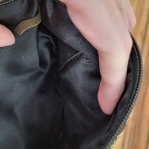 Pink stain on the bottom center, a couple of small pink stains on the inside, slight wear marks around the bottom back and the patent strap has some cracks. See the pictures for reference.