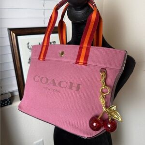 Chic pink Coach tote with vibrant cherry detail. Features bold striped handles.