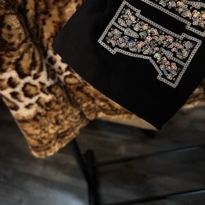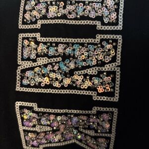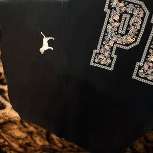 Stylish black leggings. Features bold silver PINK logo. Comfortable and trendy. Sequins that shine like a pinkish and blue and purple. Wore one tine mabe. Bc I dont remember wearing them. They are very nice. Yoga.