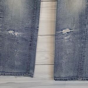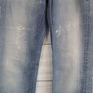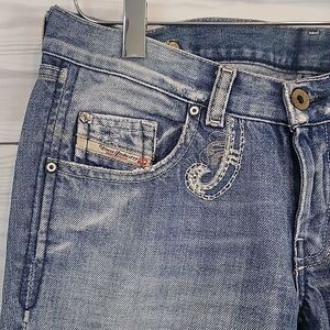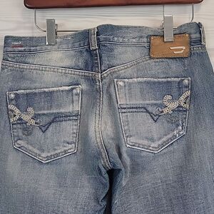 Premium fashion denim doozy jeans by Diesel featuring its unique styling of designer stitching, manufacturer distressing including rips and tears, fading and whiskering. These jeans sport a low-rise and a straight leg. Great pre-owned condition.