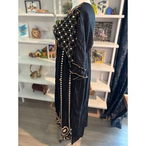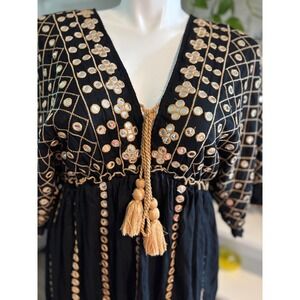 Keywords: maxi dress, boho dress, bohemian dress, kaftan dress, mirror embellishment, tassel tie, v neck dress, long dress, black dress, summer dress, beach dress, festival dress, casual dress
