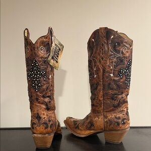 Elevate your look with these stunning studded western heeled boots. The rich brown color and intricate detailing make them a standout choice for any occasion.