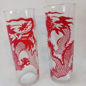 Made of glass, these tumblers are durable and perfect for entertaining guests or everyday use in your home. The red dragon design adds a fun and distinctive touch to the classic Tom Collins glass shape.