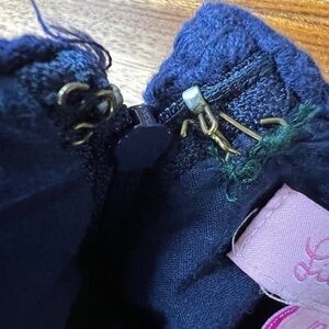 Preowned - perfect condition other than the hook at the top of the zipper. It has been reinforced and is functional. Just a minor flaw on a beautiful dress!
